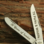 An example of the premium engraving is shown on the blades of a Trapper in both Block and Script
