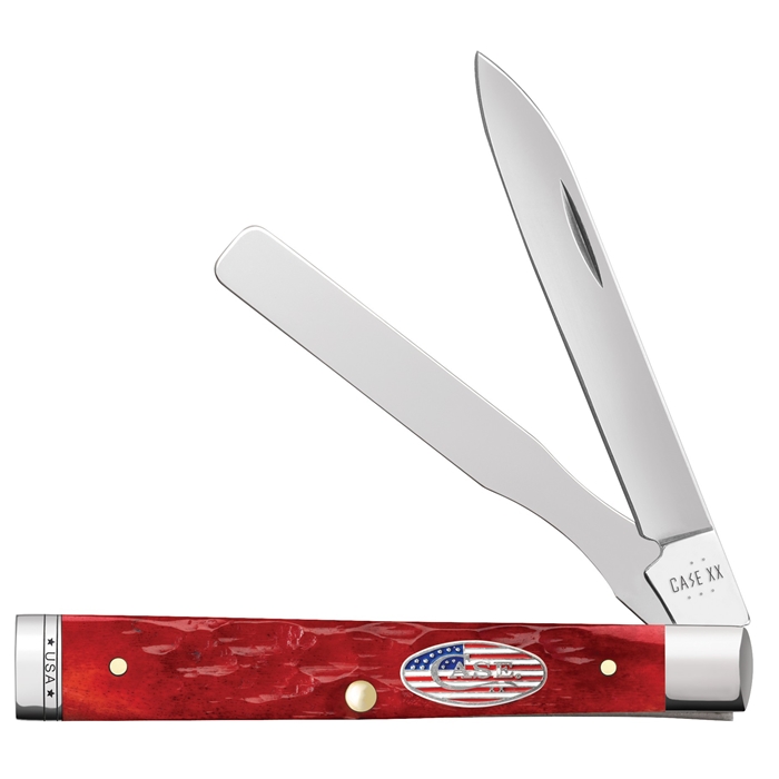 An example of the premium engraving is shown on the blades of a Trapper in both Block and Script.